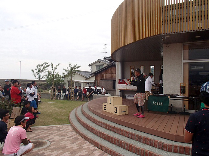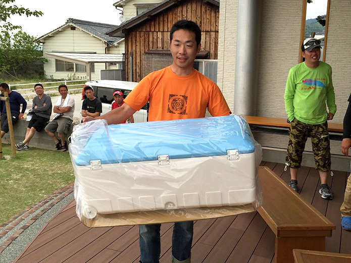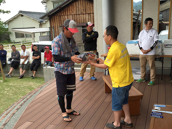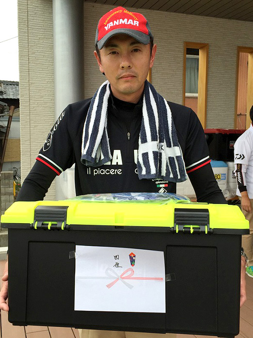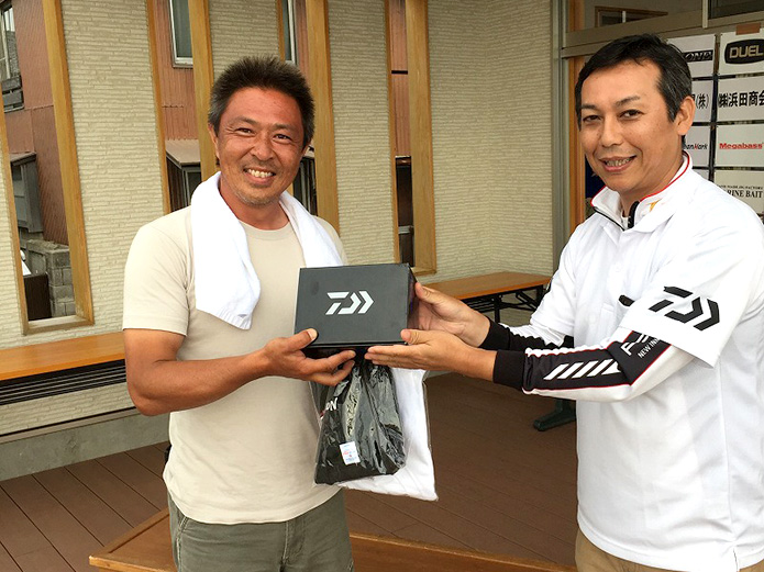 ▲ なんと!5位入賞の玉垣様!見事じゃんけんでダイワの大型クーラーゲットですっ! |